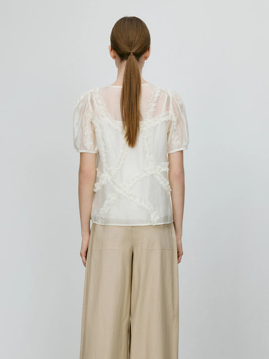 Sheer Short Puff Sleeves Blouse + Tank with Ruffles Design