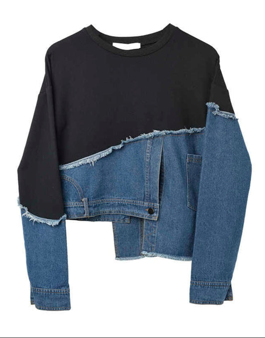 Denim Patchwork Asymmetrical Long Sleeve Sweatshirt