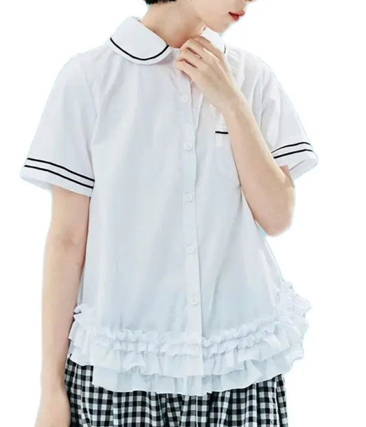 Polo Style Short Sleeves Dress Shirt with Ruffle Hem