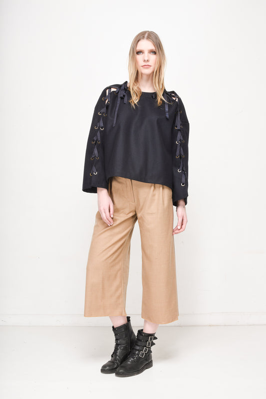 Lose Fit Trendy Wool Top with Lacing Sleeves