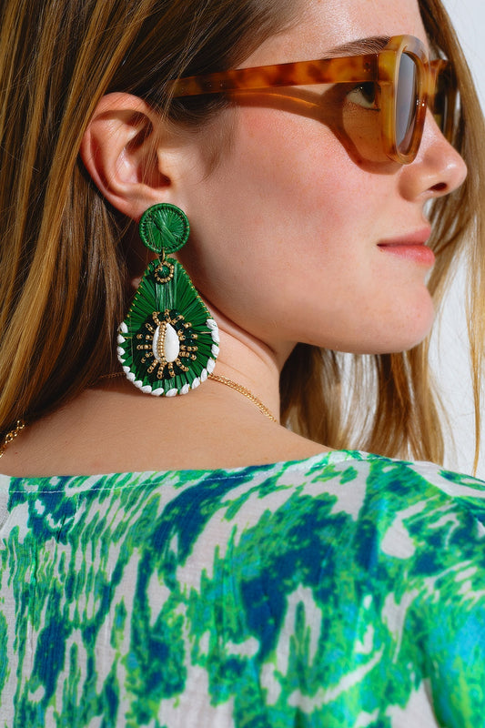 Maxi Embroidered Flower Rafia Earrings With Sea Shell Details in Lime