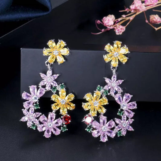 Elegant Purple Crystal Flower Ring Drop Earrings